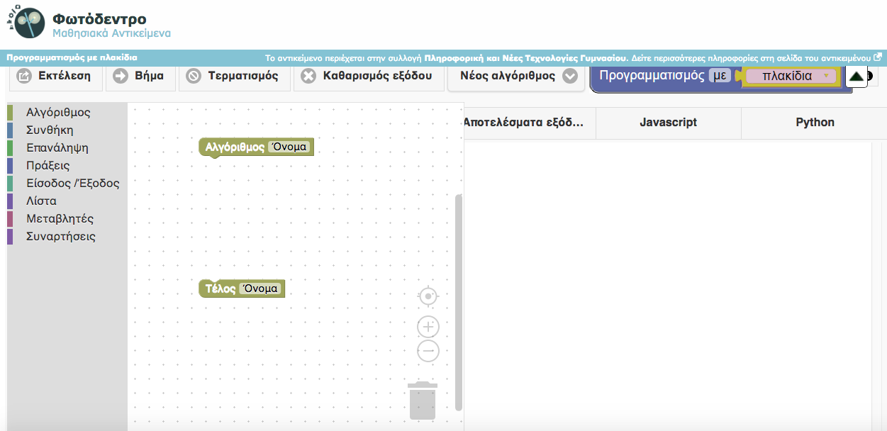 Μεταβείτε στην ιστοσελίδα φωτόδεντρο. Στην εικόνα 1.3.1 βλέπετε το περιβάλλον εργασίας του Προγραμματισμού με Πλακίδια του φωτόδεντρου. Στο πάνω μέρος βλέπετε μια μπάρα εργαλείων με τα κουμπιά Εκτέλεση, Βήμα, Τερματισμός, Καθαρισμός εξόδου, Νέος αλγόριθμος. Στα αριστερά βλέπετε ένα κατακόρυφο μενού με τις επιλογές Αλγόριθμος, Συνθήκη, Επανάληψη, Πράξεις, Είσοδος/Έξοδος, Λίστα, Μεταβλητές, Συναρτήσεις. Δίπλα του βλέπετε την περιοχή ανάπτυξης των προγραμμάτων σας και δυο εντολές Αλγόριθμος και Τέλος. Δεξιά της περιοχής αυτής βλέπετε την περιοχή όπου θα εμφανίζονται τα αποτελέσματα κατά την εκτέλεση του προγράμματός σας.