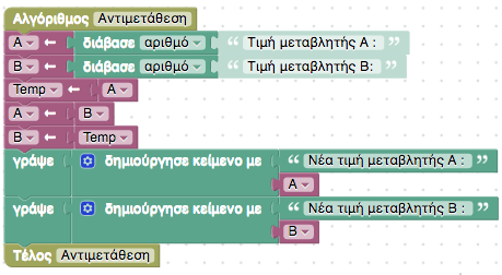 Η λύση είναι η χρήση μιας επιπλέον προσωρινής μεταβλητής η οποία θ’ αποθηκεύσει προσωρινά την προηγούμενη τιμής της μεταβλητής Α.