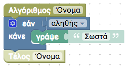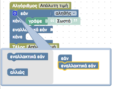 Κάντε πάλι κλικ στο γρανάζι για να κλείσετε το διαλογικό παράθυρο που εμφανίστηκε. Και προσθέστε τα κατάλληλα πλακίδια ώστε αν η συνθήκη είναι ψευδής τότε να εμφανιστεί το μήνυμα Λάθος. Υπάρχει κι η εντολή αλλιώς η οποία δε λαμβάνει συνθήκη (βλ. εικόνα 1.3.13) και η οποία ισχύει όταν όλες οι προηγούμενες συνθήκες είναι ψευδείς.