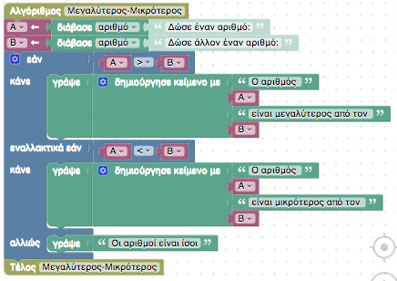 Ας δημιουργήσουμε κάτι πιο πολύπλοκο. Μας ζητείται να γράψουμε ένα πρόγραμμα το οποίο να δέχεται δυο αριθμούς Α και Β από το χρήστη και αν ο Α > Β να εμφανίζεται το μήνυμα Ο αριθμός Α είναι μεγαλύτερος από τον Β, αν Α < Β το μήνυμα Ο αριθμός Α είναι μικρότερος από τον Β, διαφορετικά Οι αριθμοί είναι ίσοι. Δοκιμάστε πρώτα να το γράψετε μόνοι σας.