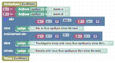 Το πρόγραμμα ζητάει από το χρήστη δυο ακέραιες τιμές τις οποίες αποθηκεύει στις μεταβλητές α και β. Στη συνέχεια ελέγχει αν είναι και οι δυο θετικοί με τη συνθήκη α > 0 και β > 0 και εμφανίζει το μήνυμα “Και οι δυο αριθμοί είναι θετικοί”. Στη συνέχεια ελέγχει πάλι αν οι δυο αριθμοί είναι θετικοί με τη συνθήκη α > 0 ή β >0. Αυτή η συνθήκη ικανοποιείται αν ένας από τους δυο ή και οι δυο αριθμοί είναι θετικοί, οπότε εμφανίζεται το μήνυμα “Τουλάχιστο ένας από τους δυο αριθμούς είναι θετικός”. Διαφορετικά εμφανίζει το μήνυμα ότι κανείς από τους δυο αριθμούς δεν είναι θετικός (δηλ. είναι είτε και ή δυο αρνητικοί ή ένας από τους δυο ή και οι δυο μηδέν).