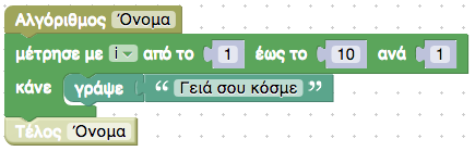 Ας δούμε πώς μπορούμε να χρησιμοποιήσουμε καθεμιά από αυτές τις δυο εντολές για να λύσουμε το πρόβλημα που αναφέραμε πιο πάνω. Η πρώτη εντολή χρησιμοποιεί μια μεταβλητή μετρητή i η οποία μετράει από το 1 μέχρι το 10 με βήμα 1, δηλ. 1, 2, 3,…, 10. Για κάθε τιμή του μετρητή εμφανίζει στην οθόνη το “Γειά σου κόσμε”.