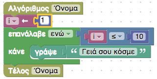 Εκτελέστε το πρόγραμμα βήμα-βήμα για να δείτε πώς εκτελείται. Η άλλη εντολή επανάληψης είναι λίγο πιο δύσκολη. Θα χρειαστεί να δημιουργήσουμε μια συνθήκη ώστε να σταματήσει η εντολή επανάληψης, διαφορετικά ο βρόγχος θα εκτελείται επ’ άπειρω. Η συνθήκη αυτή θα λέει ότι ο βρόγχος θα πρέπει να εκτελεστεί το πολύ 10 φορές, δηλ. i ≤ 10. Θα πρέπει να δημιουργήσουμε τη μεταβλητή i και να την αρχικοποιήσουμε: i ← 1.