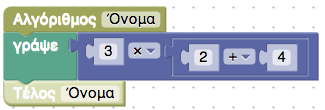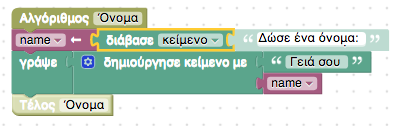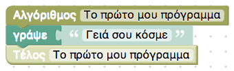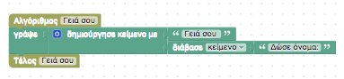 Για να εμφανίσουμε κάτι στην έξοδο χρειαζόμαστε την εντολή γράψε. Προσθέστε λοιπόν την εντολή αυτή μεταξύ των εντολών Αλγόριθμος και Τέλος όπως είδαμε προηγουμένως. Στη συνέχεια θα πρέπει να δημιουργήσουμε την έξοδό μας από τις δυο εισόδους που περιγράψαμε πιο πάνω, οπότε εισάγετε την εντολή δημιούργησε κείμενο με και ‘κολλήστε’ τη στην εντολή γράψε. Βλέπουμε ότι η εντολή δημιούργησε κείμενο με δέχεται δυο εισόδους. Στη μια εισάγετε το κείμενο “Γειά σου “ και στο άλλο την εντολή διάβασε δίνοντας το κείμενο προτροπής "Δώστε όνομα" όπως φαίνεται στην παρακάτω εικόνα: