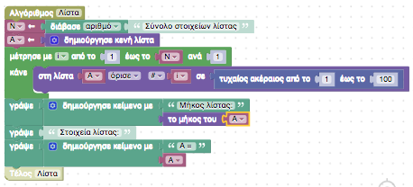 Κατ’ αρχήν ζητάμε ο χρήστης να μας δώσει τον αριθμό των στοιχείων Ν που θ’ αποθηκευθούν στη λίστα. Στη συνέχεια δημιουργούμε μια νέα λίστα Α, και αποθηκεύουμε Ν τυχαίους αριθμούς σ’ αυτήν μέσα σε μια εντολή επανάληψης από το 1 μέχρι το Ν (οι αριθμοί αυτοί μπορούν να παίρνουν τιμές από το 1 μέχρι το 100). Χρησιμοποιώντας την εντολή τυχαίος αριθμός από το 1 μέχρι το Ν (του μενού Πράξεις) το φωτόδεντρο δημιουργεί τυχαίους αριθμούς σ’ αυτό το διάστημα.