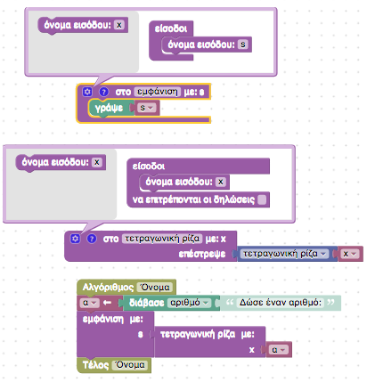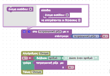 Το κύριο πρόγραμμα (δηλ. οι εντολές μεταξύ της εντολής Αλγόριθμος και Τέλος) διαβάζει μια τιμή από το χρήστη και την αποθηκεύει στη μεταβλητή α. Στη συνέχεια, με την εντολή τετραγωνική ρίζα με: x καλεί τη συνάρτηση περνώντας στην τιμή της παραμέτρου x την τιμή της α (x <- α) (η α ονομάζεται όρισμα γιατί παρέχει τιμή στην παράμετρο x) και επιστρέφει το αποτέλεσμα που είναι η τετραγωνική ρίζα του αριθμού που δώσαμε.