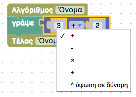 Όπως ίσως γνωρίζετε, οι Η/Υ είναι πολύ αποτελεσματικοί στο να εκτελούν πολύπλοκες πράξεις. Ας το δούμε λοιπόν στην πράξη, με απλές όμως πράξεις ώστε να μπορούμε να ελέγξουμε το αποτέλεσμα. Ας ξεκινήσουμε λοιπόν από ένα άδειο πρόγραμμα και ας προσθέσουμε την εντολή γράψε μεταξύ των πλακιδίων Αλγόριθμος και Τέλος. Αυτή τη φορά σύρτε από το μενού Πράξεις το πλακίδιο της πρόσθεσης όπως φαίνεται στην παρακάτω εικόνα.
