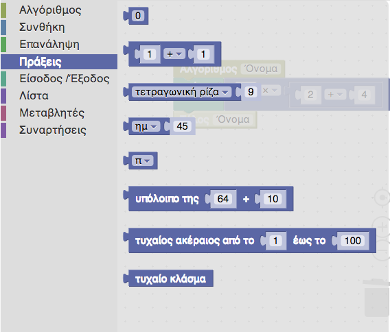 Δοκιμάστε καθεμία από τις εντολές αυτές. Είναι λογικό το αποτέλεσμα; Π.χ. τι κάνει η εντολή τυχαίος αριθμός από το 1 έως το 100; Μάθετε περισσότερα για τις αριθμητικές πράξεις εδώ.