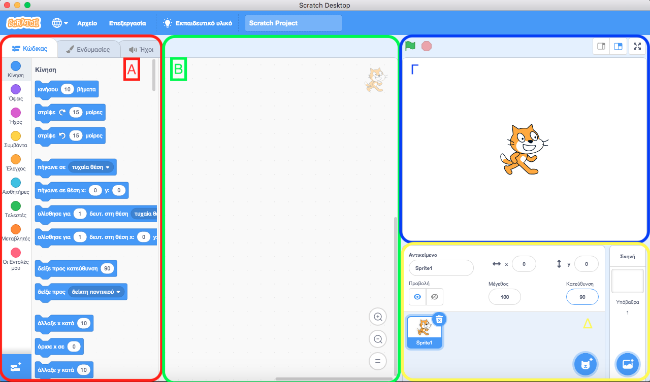 Scratch Project. - Η περιοχή Α περιέχει τις διάφορες εντολές που μπορούμε να χρησιμοποιήσουμε για να προγραμματίσουμε το Scratch. Αυτές χωρίζονται σε διάφορες κατηγορίες ή παλέτες (π.χ. Κίνηση, Ήχος, Συμβάντα κλπ.).