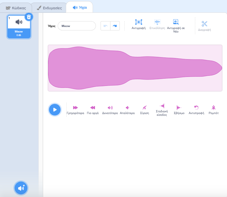 Παρόμοια είναι και η καρτέλα Ήχοι. Μπορείτε να προσθέσετε ήχους πατώντας στο στρογγυλό κουμπί κάτω αριστερά (είτε από τους έτοιμους που παρέχει το Scratch είτε εγγράφοντας εσύ δικούς σας) ή να τροποποιήσετε τον επιλεγμένο ήχο με τα κουμπιά κάτω από την κυματομορφή του. Μη φοβάστε να δοκιμάσετε τα διάφορα εφέ. Αν κάτι δε σας αρέσει μπορείτε να πατήσετε τα κουμπάκια Αναίρεση (και Επανάληψη) για να αναιρέσετε τα εφέ που εφαρμόσατε.