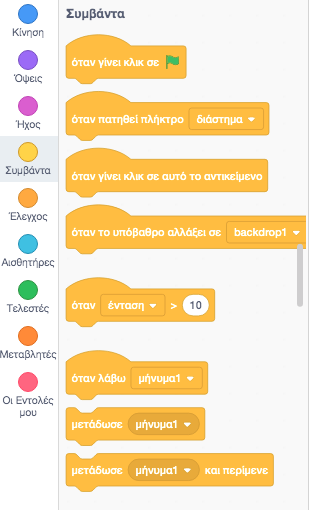 Ας ξεκινήσουμε με τις εντολές της παλέτας Συμβάντα (βλ. Εικόνα 2.1.3). Η πιο σημαντική ίσως εντολή είναι η “όταν γίνει κλικ σε” η οποία δηλώνει την αρχή του προγράμματός μας. Όταν πατήσουμε τη πράσινη σημαιούλα ξεκινά η εκτέλεση του προγράμματός μας. Βλέπουμε κι άλλους τρόπους εκτέλεσης του προγράμματος, όπως όταν πατηθεί κάποιο πλήκτρο ή όταν κάνουμε κλικ με το ποντίκι πάνω σε κάποιο αντικείμενο κ.ο.κ. Μπορείτε να προσθέσετε π.χ. περισσότερες από μια εντολές “όταν γίνει κλικ σε” και να εκτελέσετε διαφορετικά προγράμματα παράλληλα! Βέβαια, αρκεί απλά να κάνετε κλικ με το ποντίκι πάνω σε μια στοίβα εντολών για να την εκτελέσετε, χωρίς να προσθέσετε στην αρχή της την εντολή “όταν γίνει κλικ σε”.