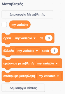 Όπως μάθαμε και στο Φωτόδεντρο, και το Scratch υποστηρίζει τη δημιουργία μεταβλητών καθώς και λίστας.