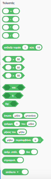 Οι τελεστές που υποστηρίζει το Scratch φαίνονται στην εικόνα 2.1.7. Βλέπουμε ότι υποστηρίζονται οι αριθμητικές πράξεις +, -, *, / καθώς και το ακέραιο υπόλοιπο, οι τελεστές σύγκρισης <, >, = οι λογικοί τελεστές και, ή, όχι κλπ. Μπορείτε επίσης να συνενώσετε μεταξύ τους αλφαριθμητικά με την εντολή ένωσε.