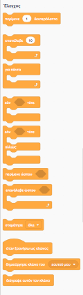 Οι εντολές ελέγχου περιλαμβάνουν τις εντολές αποφάσεων (π.χ. εάν ... τότε) και επανάληψης (π.χ. επανέλαβε) που μάθαμε στο Φωτόδεντρο. Δέχονται, όπως μάθαμε στα μαθήματα τις προηγούμενης εβδομάδας, συνθήκες που μπορούν να είναι είτε αληθής είτε ψευδής. Τις συνθήκες αυτές μπορείτε να τις βρείτε στην παλέτα Τελεστές που είδαμε πιο πάνω.
