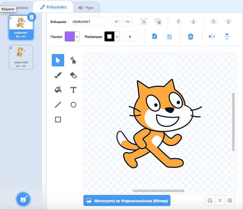 Επιλέγοντας τον ήρωά σας (τη γατούλα στην προκειμένη περίπτωση) και επιλέγοντας την καρτέλα Ενδυμασίες βλέπουμε τις δυο ενδυμασίες της γατούλας. Όπως θα μάθουμε σε επόμενο μάθημα να κινούμε τη γατούλα, μπορούμε να εναλλάσουμε αυτές τις δυο ενδυμασίες για να δείχνουμε μια πιο φυσική κίνηση της γατούλας ώστε να φαίνεται ότι κινεί τα πόδια της. Μπορείτε να προσθέσετε ενδυμασίες πατώντας στο στρογγυλό κουμπί κάτω αριστερά (είτε από τις έτοιμες είτε βγάζοντας φωτογραφίες από την κάμερα του Η/Υ ή κινητού σας) ή να τροποποιήσετε την επιλεγμένη ενδυμασία χρησιμοποιώντας τα κουμπιά ζωγραφικής που είναι παρόμοια με το πρόγραμμα Ζωγραφική των Windows.