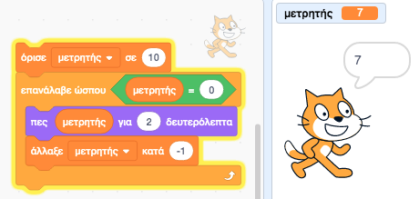 Όπως και κάθε γλώσσα προγ/σμού έτσι και το Scratch υποστηρίζει μεταβλητές. Χρησιμοποιούμε μεταβλητές ως προσωρινές αποθήκες τιμών. Μπορούμε να δημιουργήσουμε μια νέα μεταβλητή από την πλακέτα Μεταβλητές πατώντας στο κουμπί Δημιουργία Μεταβλητής. Εμφανίζεται ένα διαλογικό παράθυρο στο οποίο καλείστε να δώσετε κάποιο όνομα για τη μεταβλητή σας. Δημιουργήστε μια νέα μεταβλητή με το όνομα μετρητής. Δοκιμάστε να γράψετε ένα σενάριο (πρόγραμμα) που να μετράει από το 10 μέχρι το 0. Χρησιμοποιήστε την εντολή Πες Γειά! για 2 δευτερόλεπτα.