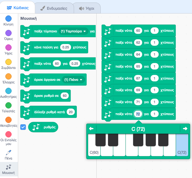 Παρατηρήστε ότι έχουμε αλλάξει τους χτύπους από 0.25 (εξ’ ορισμού) σε 1. Πώς μπορείτε μειώσετε τον αριθμό των εντολών του προγράμματος; Παρατηρήστε ότι οι τιμές αλλάζουν ως εξής: 60-62-64 και στη συνέχεια 65-67-69-71-72. Αφήνεται ως άσκηση.