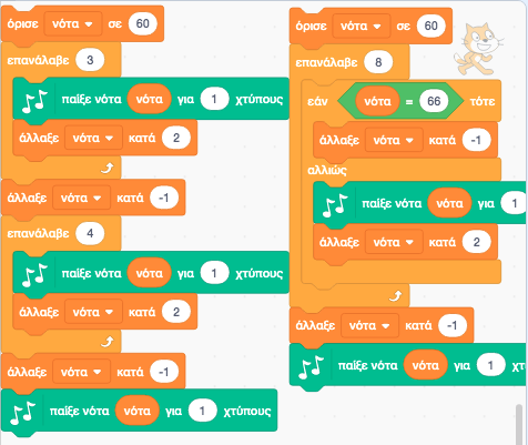 Ορίζουμε μια μεταβλητή νότα (την οποία μπορείτε να την εμφανίσετε επίσης στην περιοχή εκτέλεσης επιλέγοντας το κουμπί επιλογής της). Στην πρώτη λύση χρησιμοποιούμε δυο βρόγχους επανάληψης. Προσέξτε ότι όταν τελειώνει ο πρώτος βρόγχος η τιμή της μεταβλητής νότα = 66, δηλ. 1 παραπάνω από ότι χρειαζόμαστε για την επόμενη νότα (65), άρα μειώνουμε πρώτα τη μεταβλητή μας κατά 1.