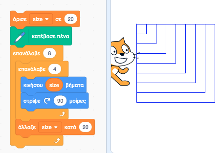 Ας δούμε τώρα πώς μπορούμε να χρησιμοποιήσουμε μια μεταβλητή για να σχεδιάσουμε πολλά σχήματα. Στην παρακάτω εικόνα ορίζουμε τη μεταβλητή size = 20 που είναι το μέγεθος ενός τετραγώνου. Μπορείτε να αναγνωρίσετε τον βρόγχο που σχεδιάζει το τετράγωνο, από το προηγούμενο μάθημα (επανέλαβε 4 φορές, κινήσου size βήματα, στρίψε 90° δεξιόστροφα). Ο εσωτερικός αυτός βρόγχος τυλίγεται από έναν εξωτερικό βρόγχο ο οποίος εκτελείται 8 φορές, και κάθε φορά αυξάνεται η τιμή της size κατά 20, δηλ. size = 20, 40, 80 κλπ. Το αποτέλεσμα φαίνεται στην παρακάτω εικόνα.