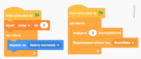 Την εντολή αρχικοποίησης της μεταβλητής σκορ μπορώ να την μεταφέρω στο σενάριο για το μαγικό ραβδί ακριβώς από κάτω από την εντολή όταν γίνει κλικ σε πράσινη σημαιούλα. Αν πατήσετε την πράσινη σημαιούλα δε συμβαίνει τίποτα. Ξεχάσαμε να πούμε στο πρόγραμμά μας να δημιουργήσει κλώνους. Αυτό το κάνουμε με την εντολή δημιούργησε κλώνο του Snowflake.
