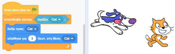 Προσθέστε έναν ακόμα χαρακτήρα (sprite), ένα σκυλάκι, επιλέξτε το και βάλτε το να κυνηγάει το γατάκι.