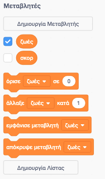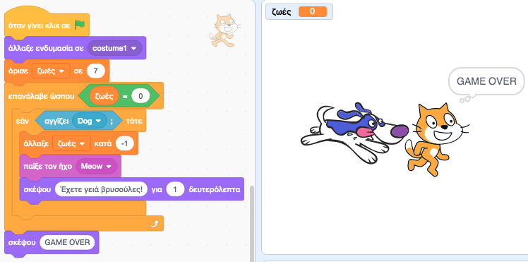 Μα με τη βοήθεια μιας μεταβλητής. Ορίστε μια νέα μεταβλητή ζωές την οποία αρχικοποιήστε στην τιμή 7 και κάθε φορά που το σκυλάκι αγγίζει τη γατούλα τη μειώνουμε κατά 1. Όταν οι ζωές της εφτάψυχης γάτας τελειώσουν, εμφανίζουμε το GAME OVER και αλλάζουμε την ενδυμασία της γάτας μας. Μπορείτε να προσθέσετε ενδυμασίες από την καρτέλα Ενδυμασίες.