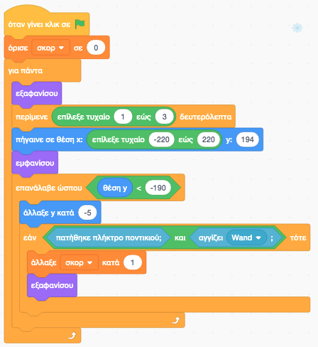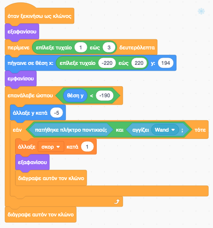Από την παλέτα Έλεγχος προσθέστε την εντολή Όταν ξεκινήσω ως κλώνος και αντικαταστήστε με αυτήν την εντολή όταν γίνει κλικ σε πράσινη σημαιούλα και προσθέστε από κάτω της ότι βρίσκεται μέσα στον ατέρμονα βρόγχο για πάντα. Όταν πατήσω πάνω της με το μαγικό ραβδί τότε μπορώ να διαγράψω αυτόν τον κλώνο, ή όταν ακουμπήσω το κάτω μέρος της σκηνής μου.