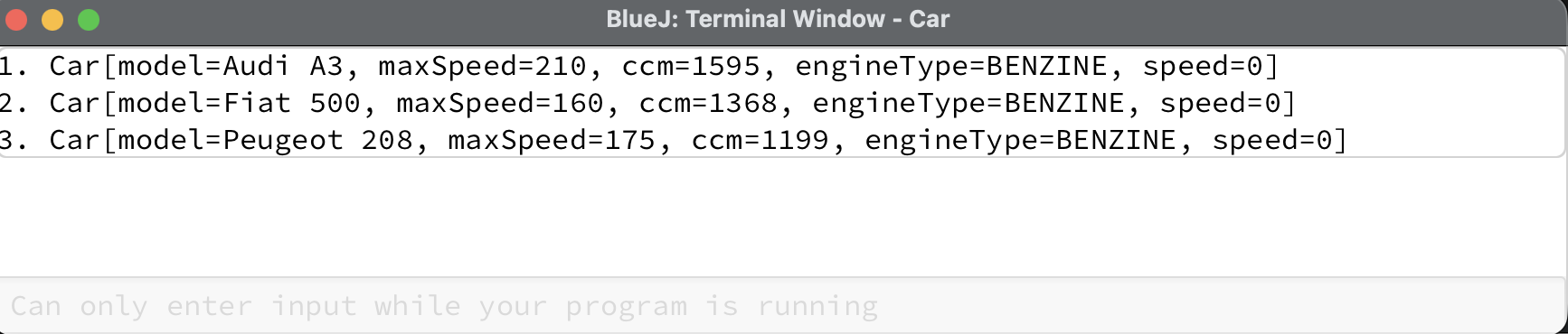 Car audiA3 = new Car("Audi A3", 210, 1595, EngineType.BENZINE);