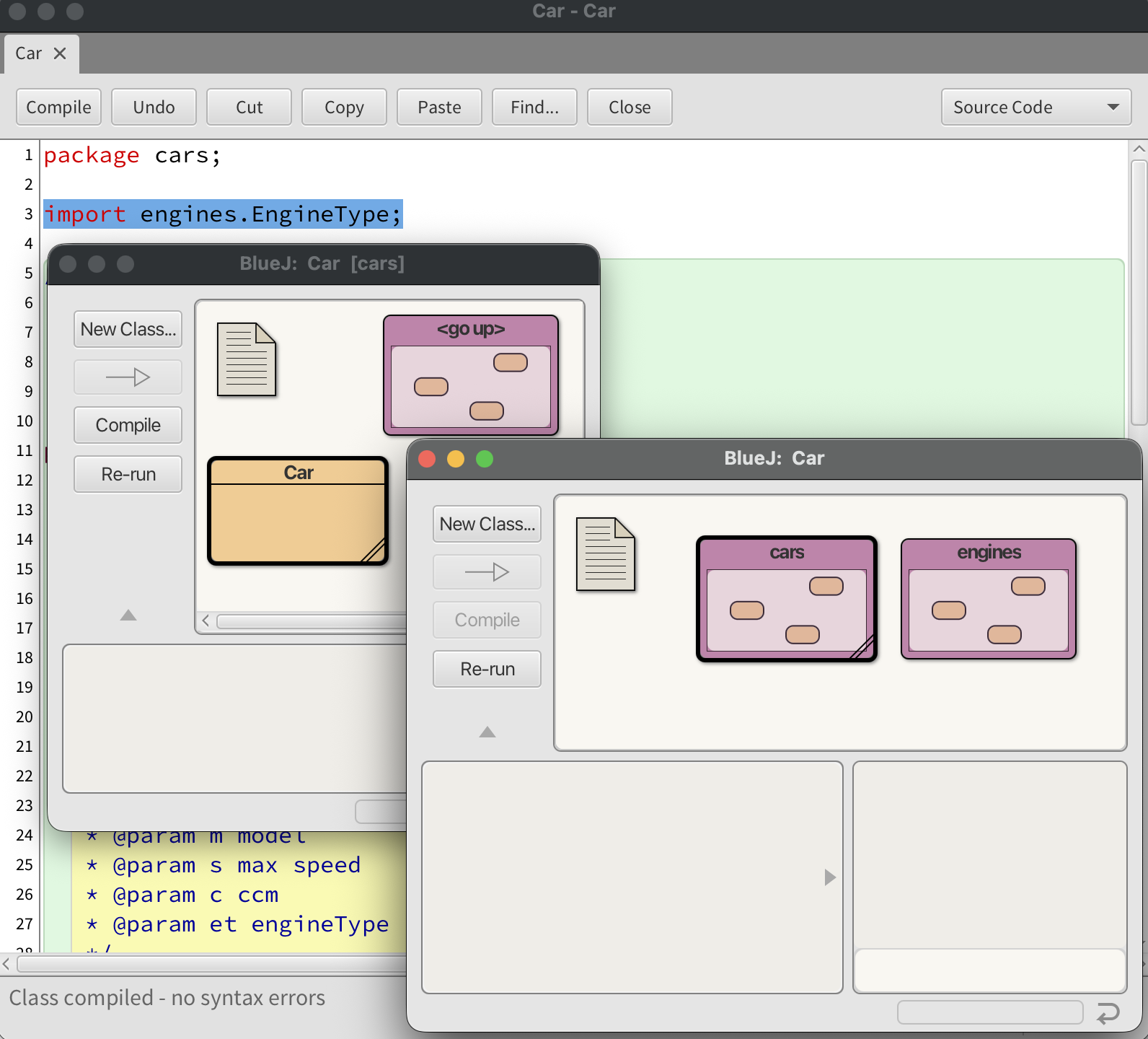 Στο έργο Car, δημιουργήστε δυο νέες βιβλιοθήκες, cars και engines, από το μενού Edit -> New Package. Στη συνέχεια, ανοίξτε την κλάση Engine και στο άνω μέρος εισάγετε τη γραμμή: