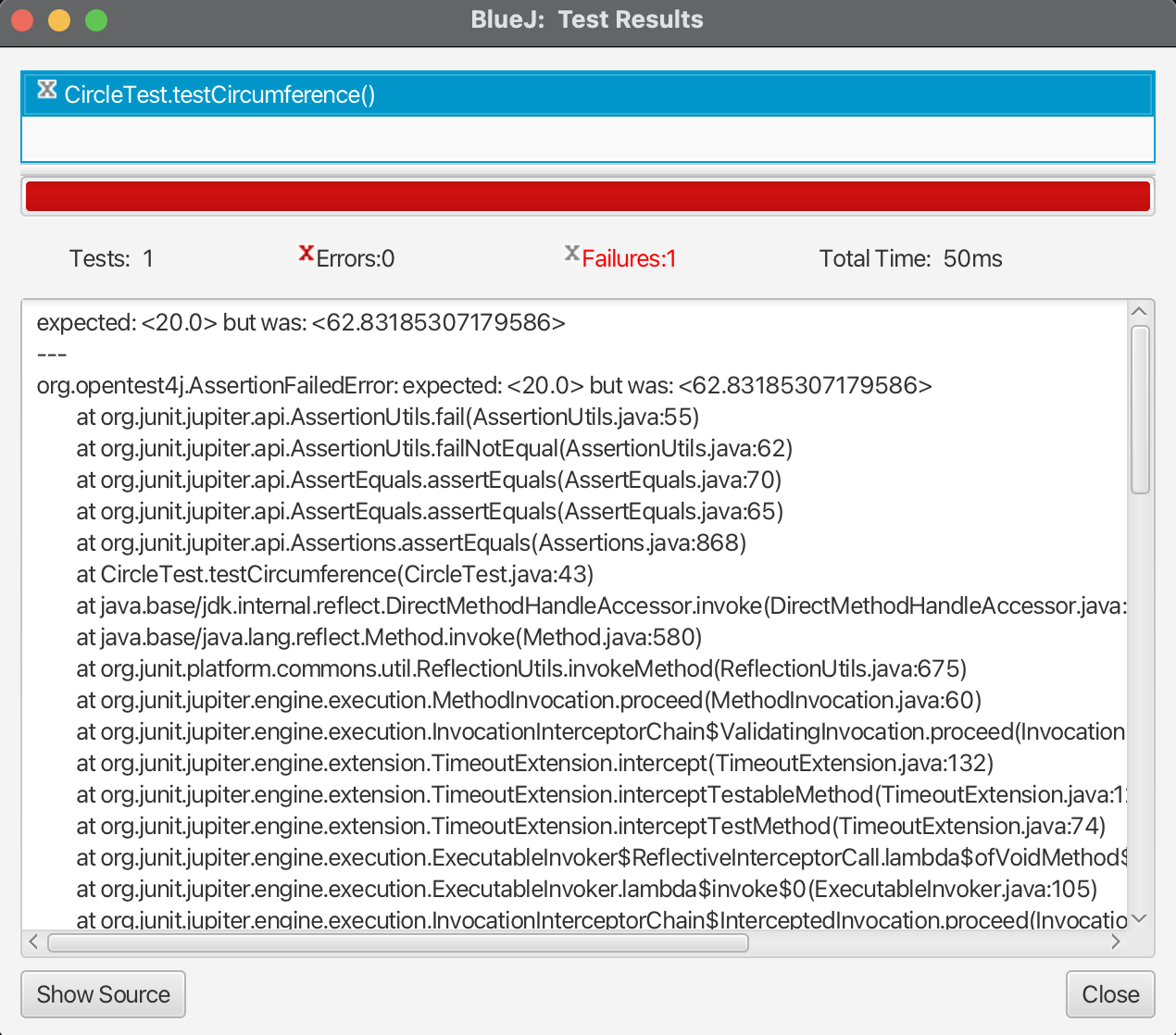 Εικόνα 3.7.2 Αποτυχία δοκιμασίας testCircumference()